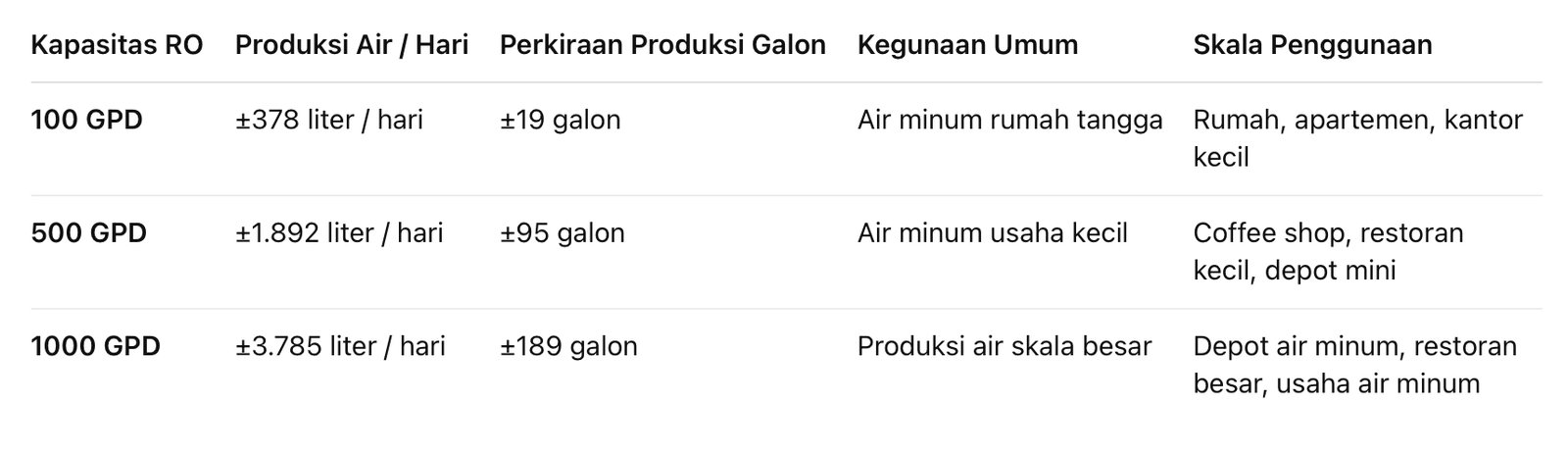 Secara umum, RO 100 GPD sangat cocok untuk kebutuhan rumah tangga dengan jumlah pengguna terbatas. Sementara itu, RO 500 GPD lebih ideal digunakan untuk kebutuhan semi komersial seperti coffee shop, restoran kecil, atau kantor dengan banyak karyawan. Untuk kebutuhan yang lebih besar seperti depot air minum, restoran besar, atau produksi air minum kemasan, RO 1000 GPD menjadi pilihan yang lebih tepat karena memiliki kapasitas produksi air yang jauh lebih besar.
