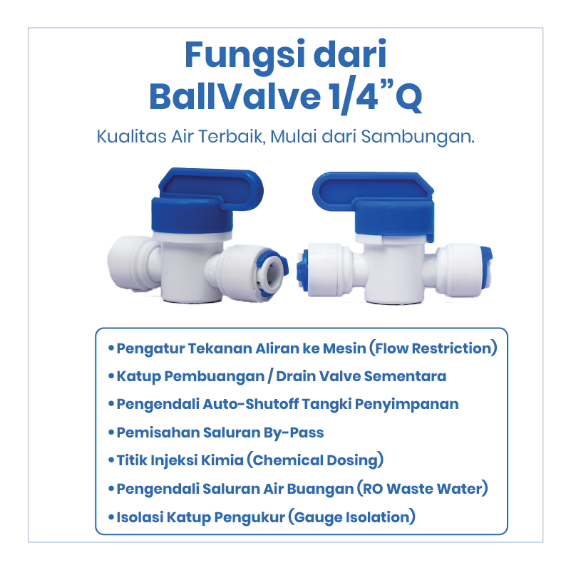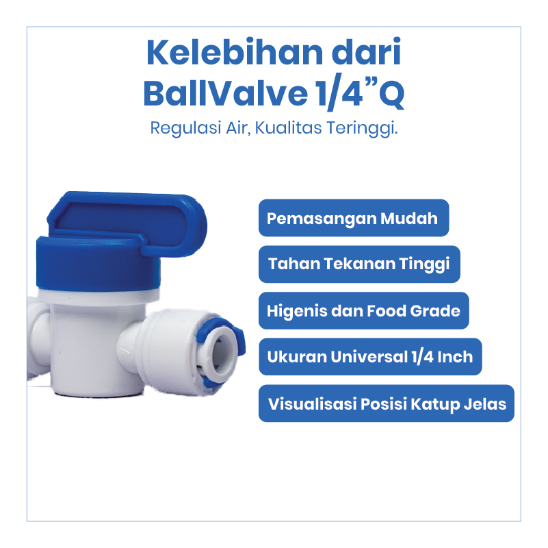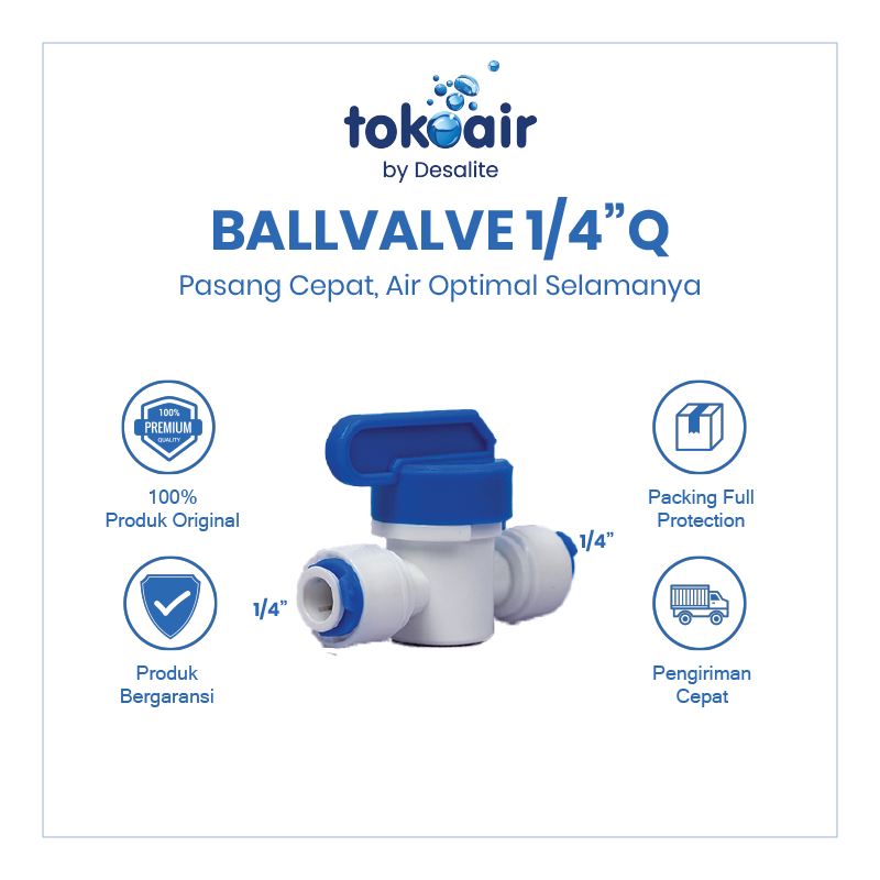 Ball Valve 1/4” Q merupakan kran air yang digunakan untuk mengatur buka–tutup aliran air pada selang RO ukuran 1/4”. Kran ini membantu proses perawatan, penggantian filter, maupun pengaturan aliran pada sistem Reverse Osmosis (RO) dan filter air.