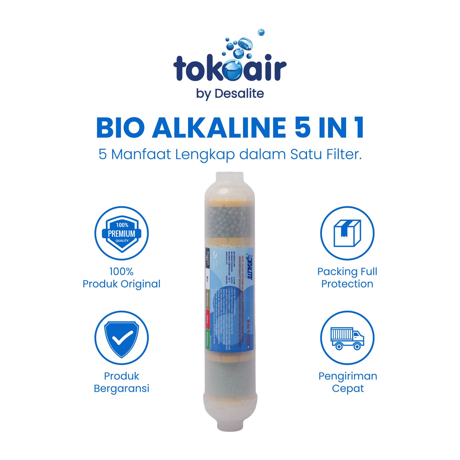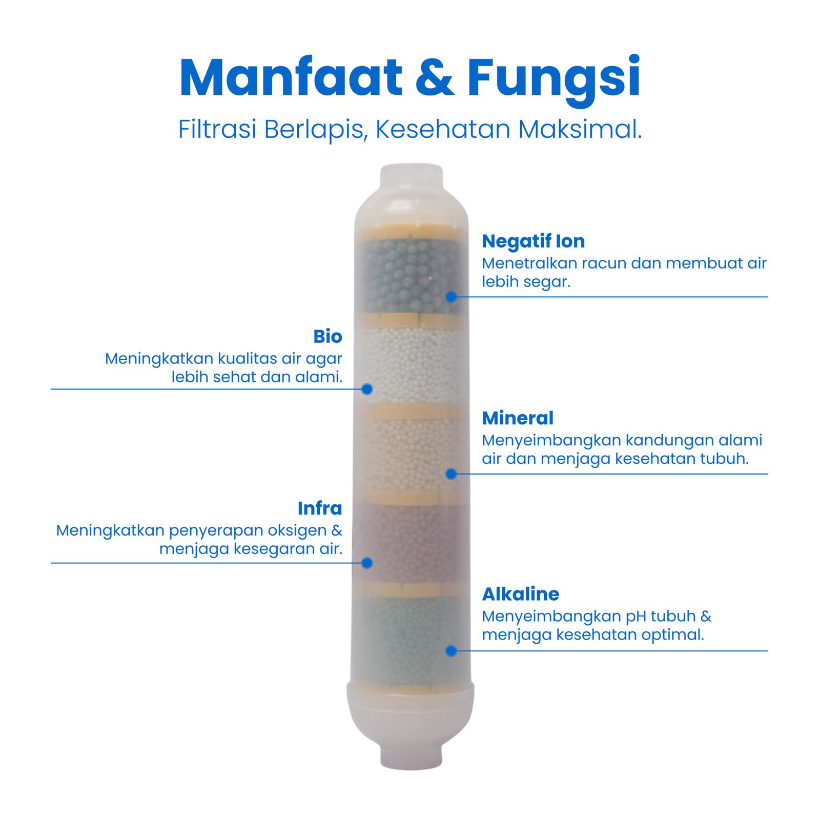 Bio Alkaline 5 in 1 merupakan media mineral kombinasi yang dirancang untuk meningkatkan pH (alkalinisasi), menambah mineral penting, membantu menetralkan zat berbahaya, serta memperbaiki kualitas dan rasa air. Media ini membantu menghasilkan air yang lebih segar, sehat, dan nyaman dikonsumsi. Umum digunakan pada mesin RO, filter air minum, dispenser RO, dan sistem water treatment sebagai tahap akhir (post treatment).