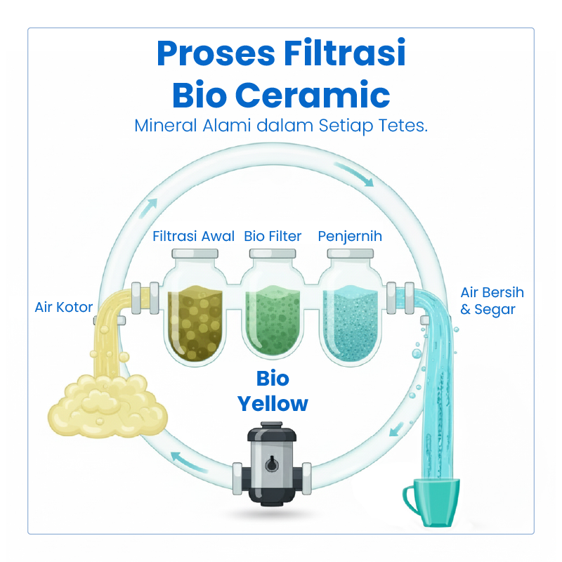 Media bio ceramic bekerja dengan melepaskan mineral alami seperti kalsium dan magnesium dalam jumlah seimbang, sehingga air terasa lebih segar dan nyaman diminum.