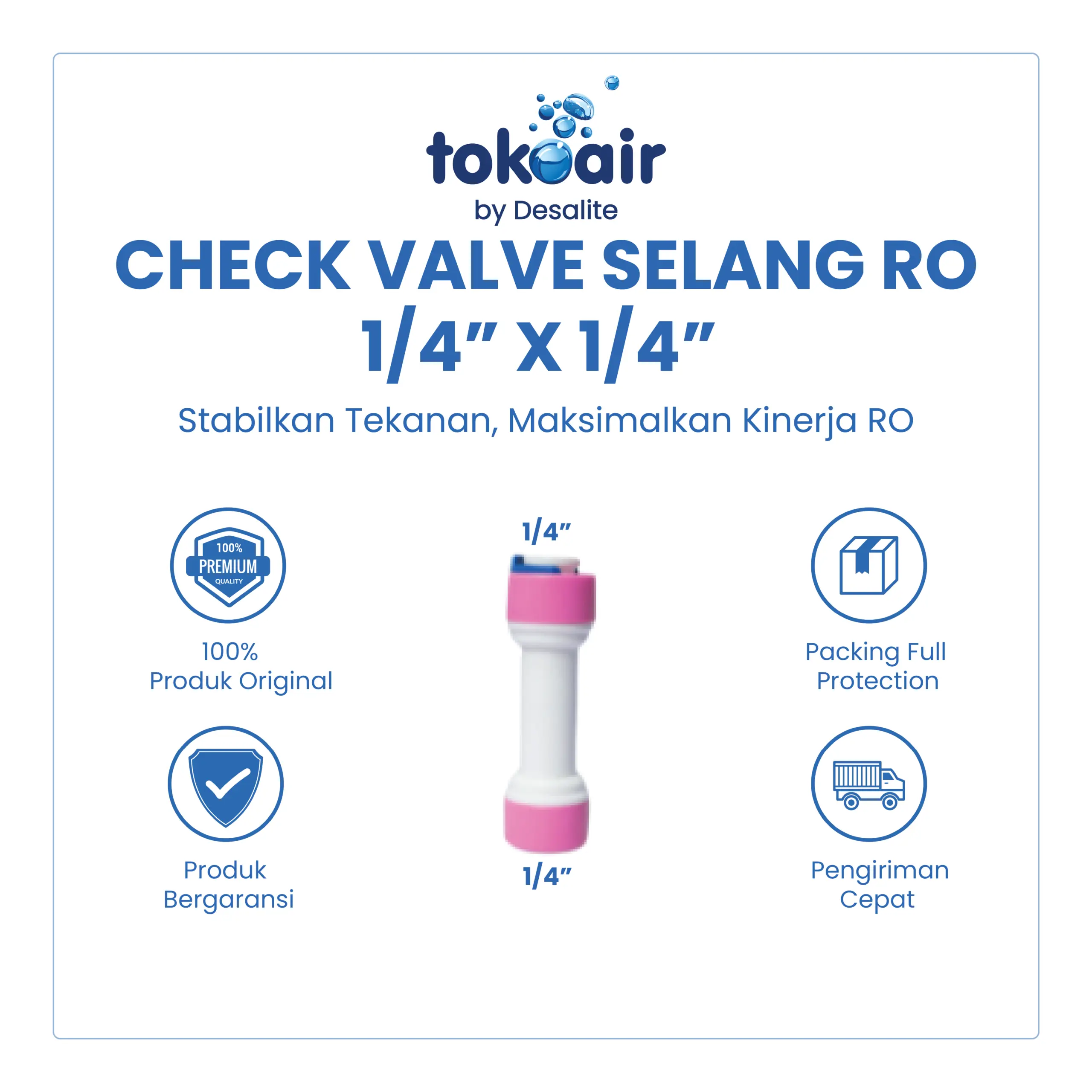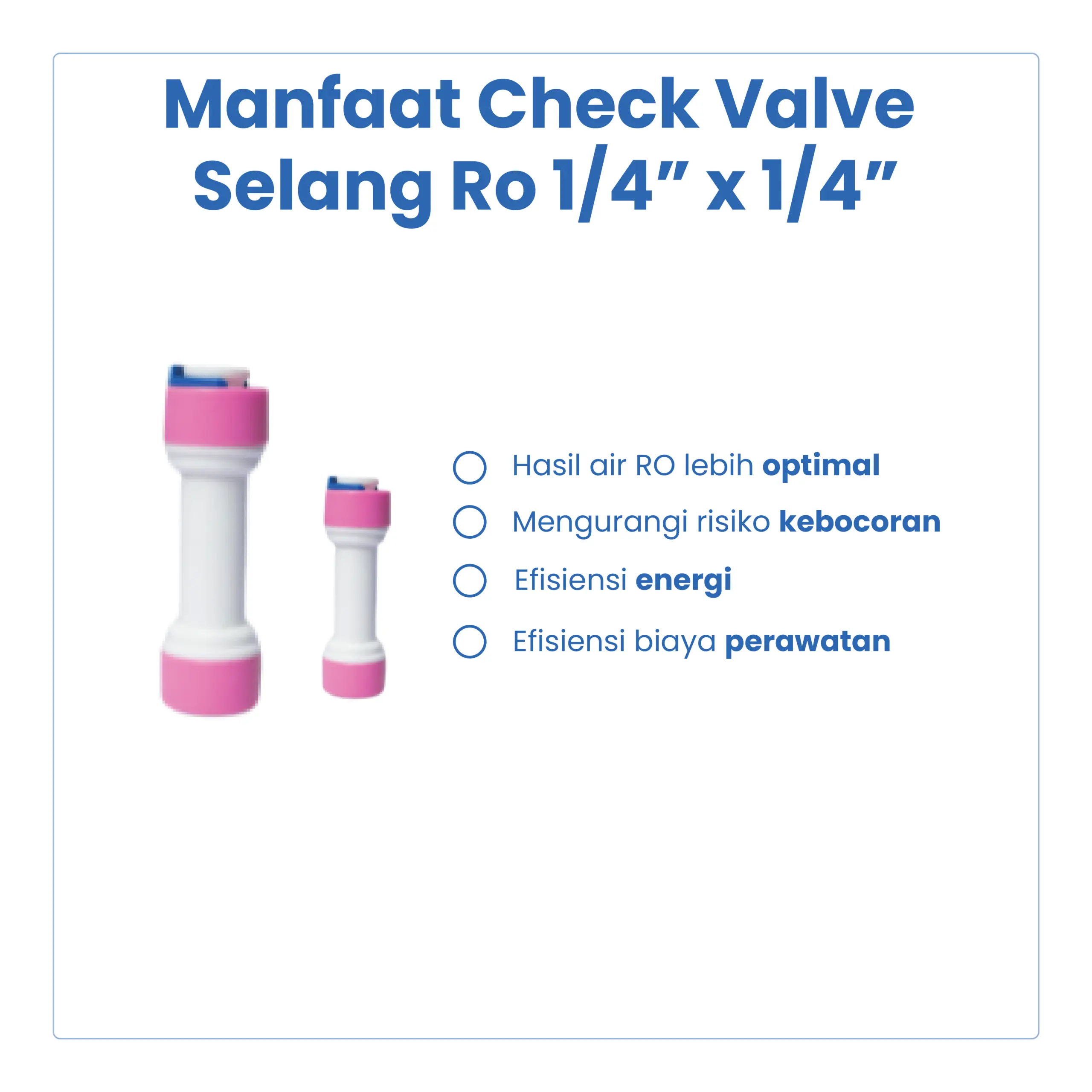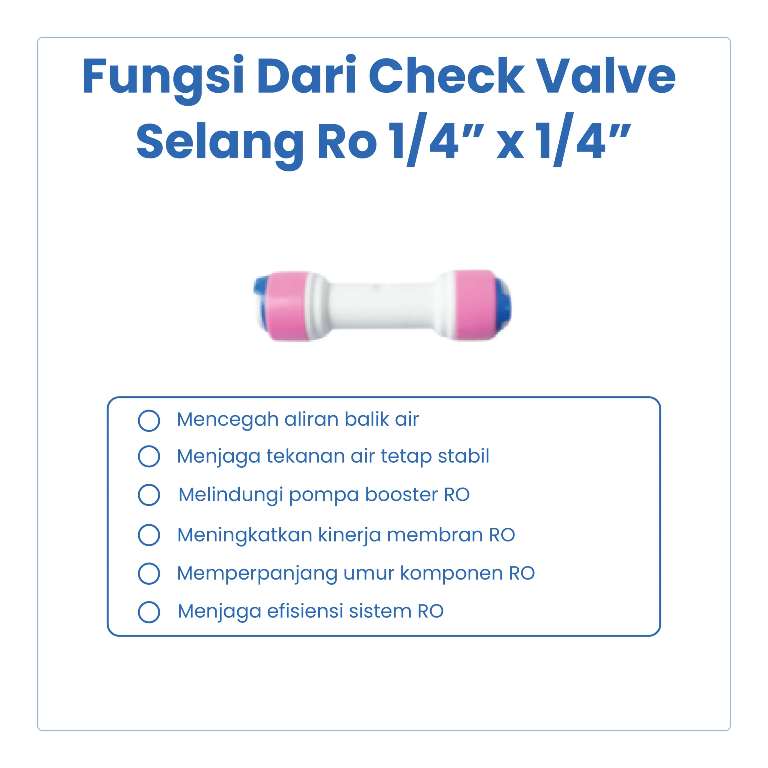 Check Valve Selang RO 1/4” x 1/4” adalah katup satu arah yang berfungsi mencegah aliran balik air pada sistem Reverse Osmosis (RO). Komponen ini sangat penting untuk menjaga kinerja membrane RO, pompa, dan komponen lainnya agar tetap optimal dan awet.