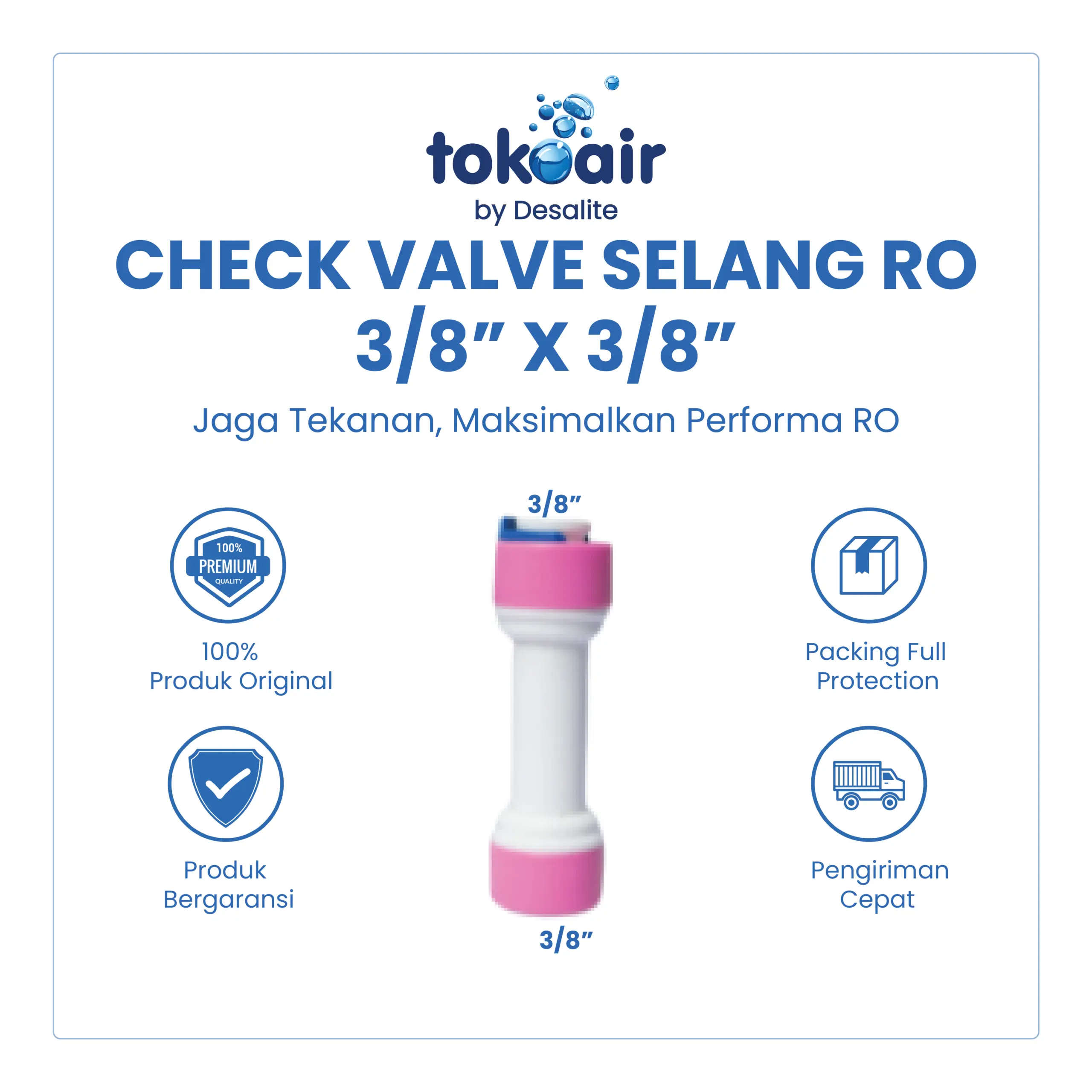 Check Valve Selang RO 3/8” x 3/8” merupakan katup satu arah yang berfungsi mencegah aliran balik air pada sistem Reverse Osmosis (RO) dan water treatment. Penggunaan check valve membantu menjaga tekanan sistem serta melindungi membrane RO dan pompa agar tetap bekerja optimal.