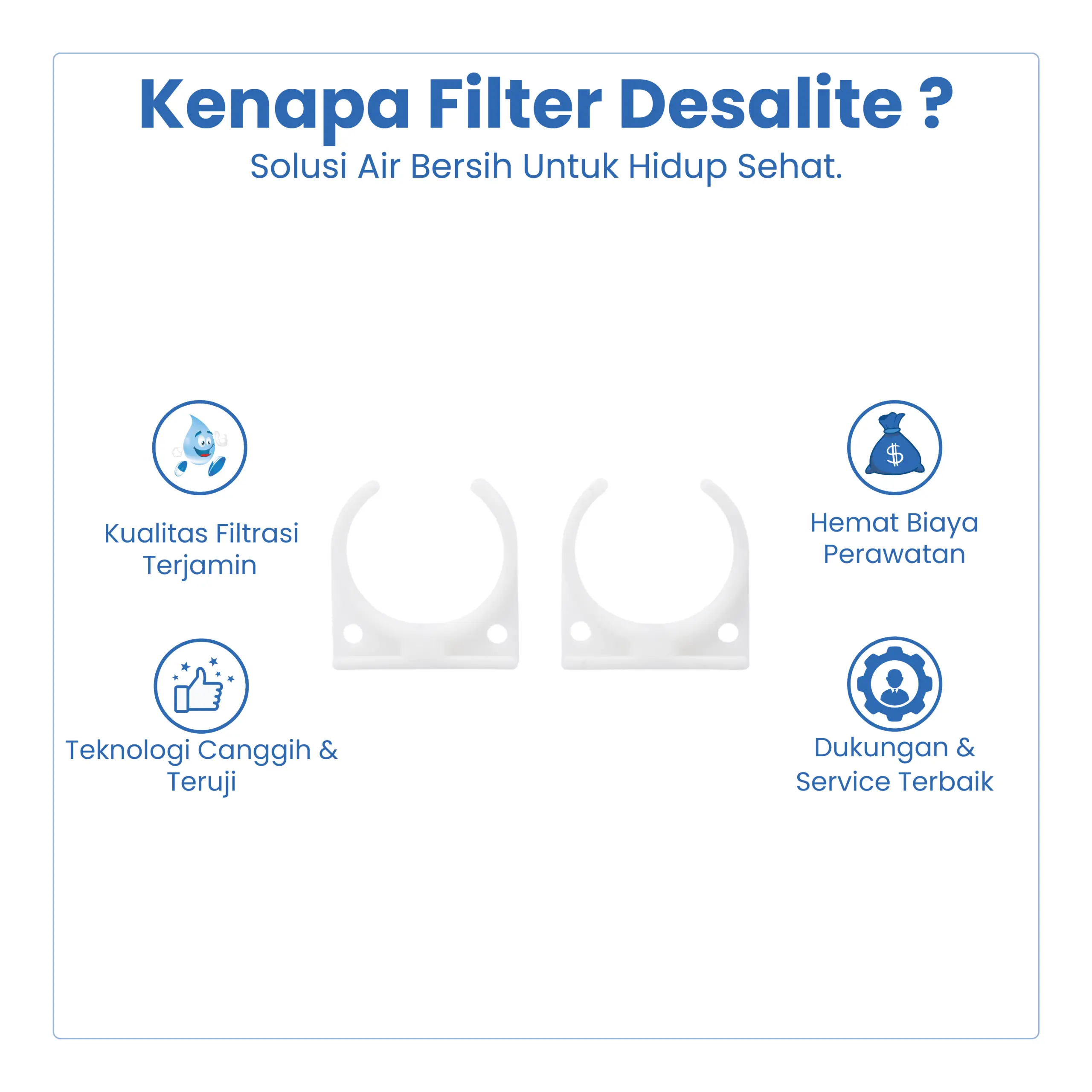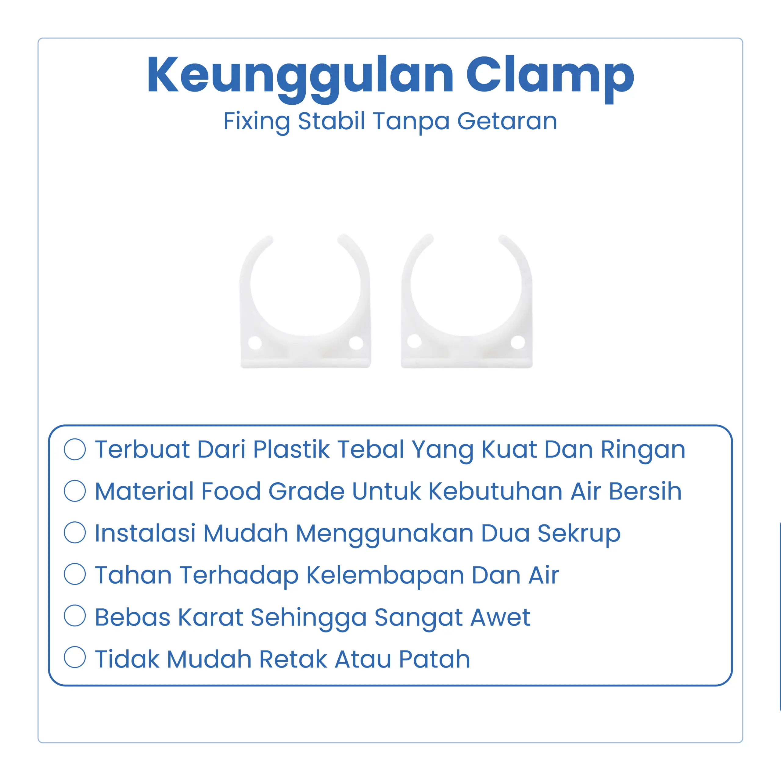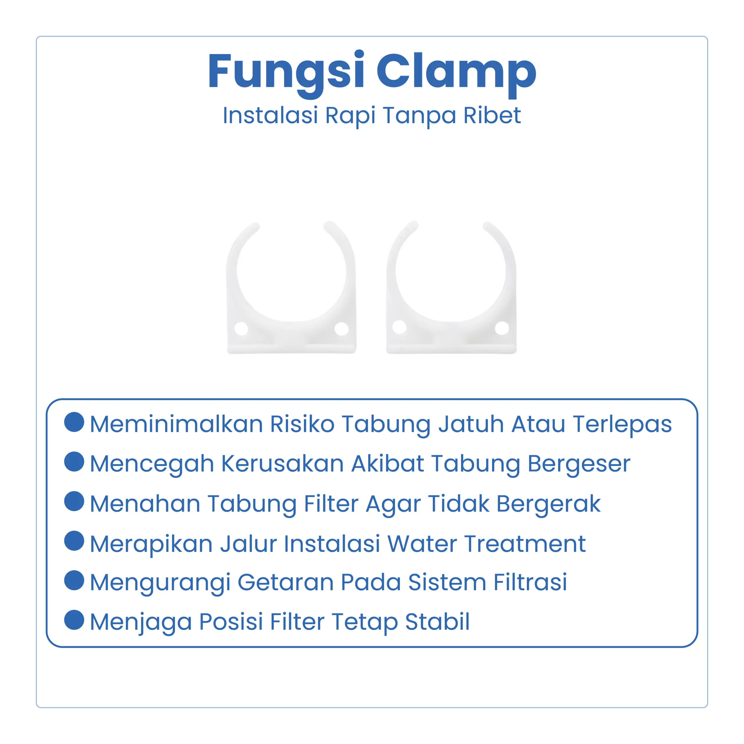Clamp merupakan aksesoris pendukung instalasi yang berfungsi untuk mengikat dan mengunci selang atau pipa pada sistem filter air, RO, dispenser, dan instalasi air lainnya agar sambungan lebih kuat dan tidak bocor.