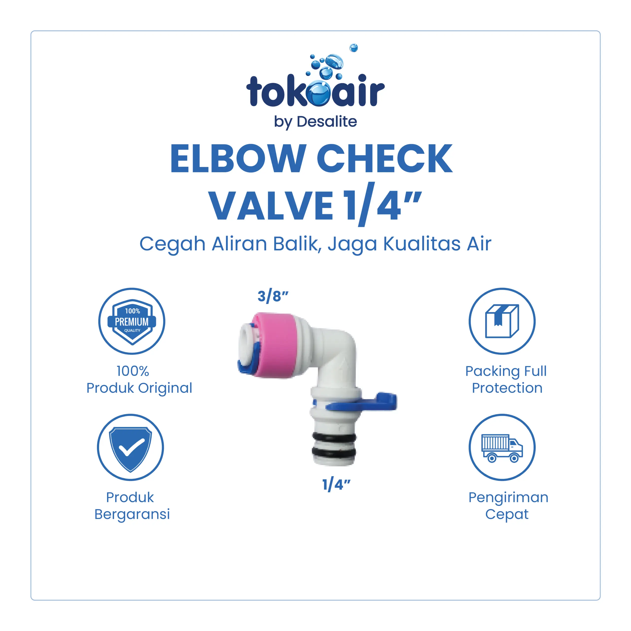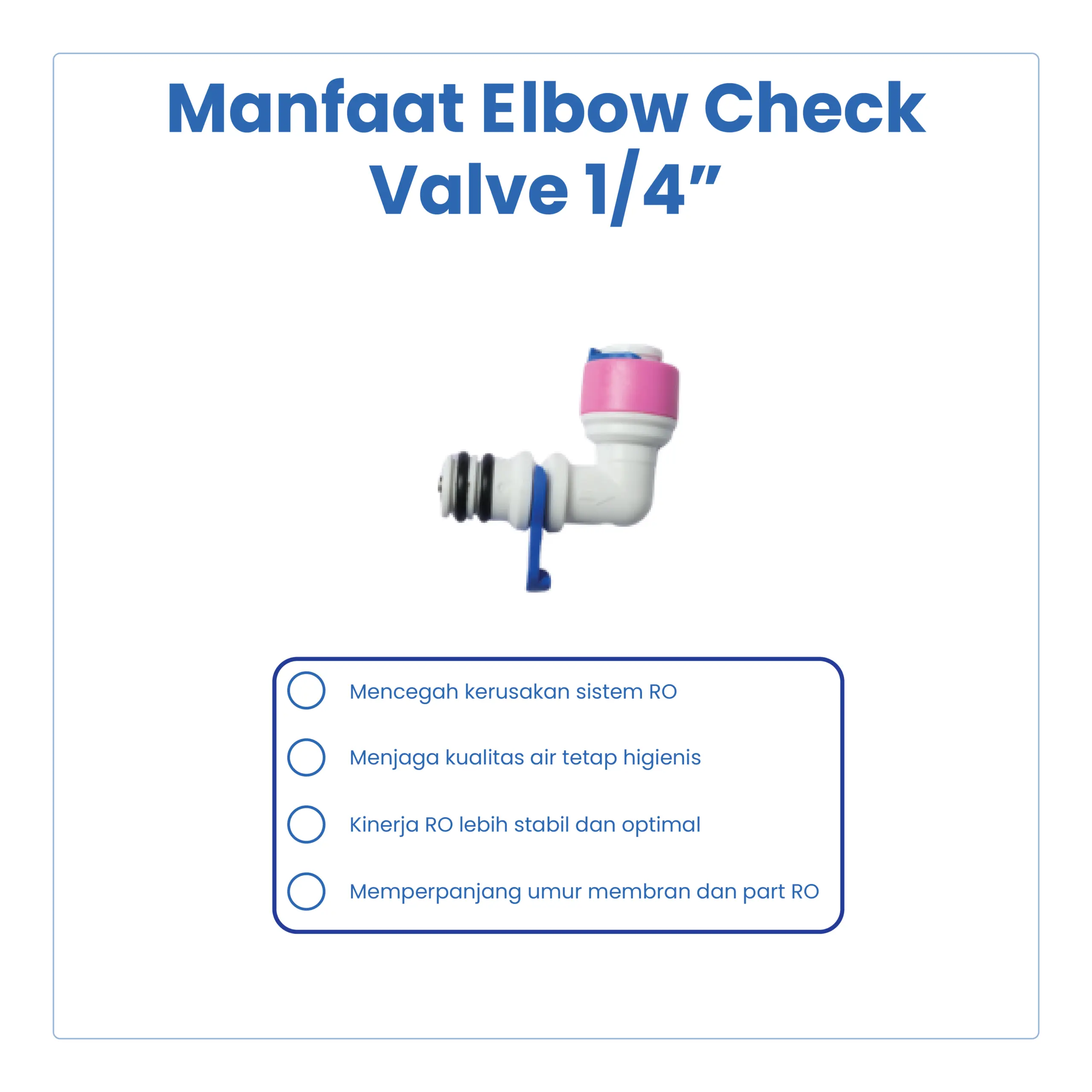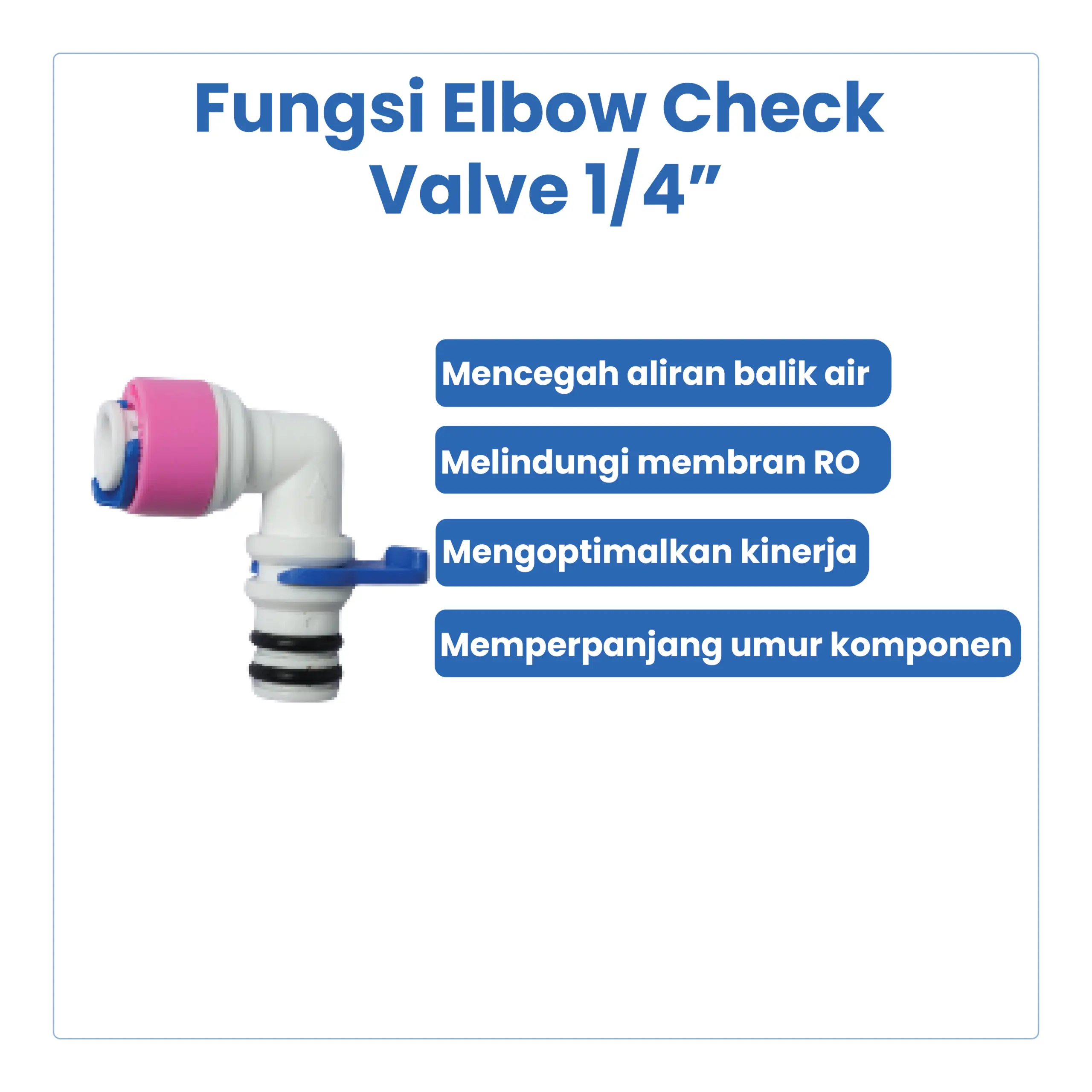 Elbow Check Valve 1/4” merupakan katup satu arah berbentuk siku (L) yang digunakan pada sistem Reverse Osmosis (RO) untuk mencegah aliran balik air. Desain elbow memudahkan instalasi pada ruang sempit sekaligus menjaga arah aliran tetap stabil dan aman.