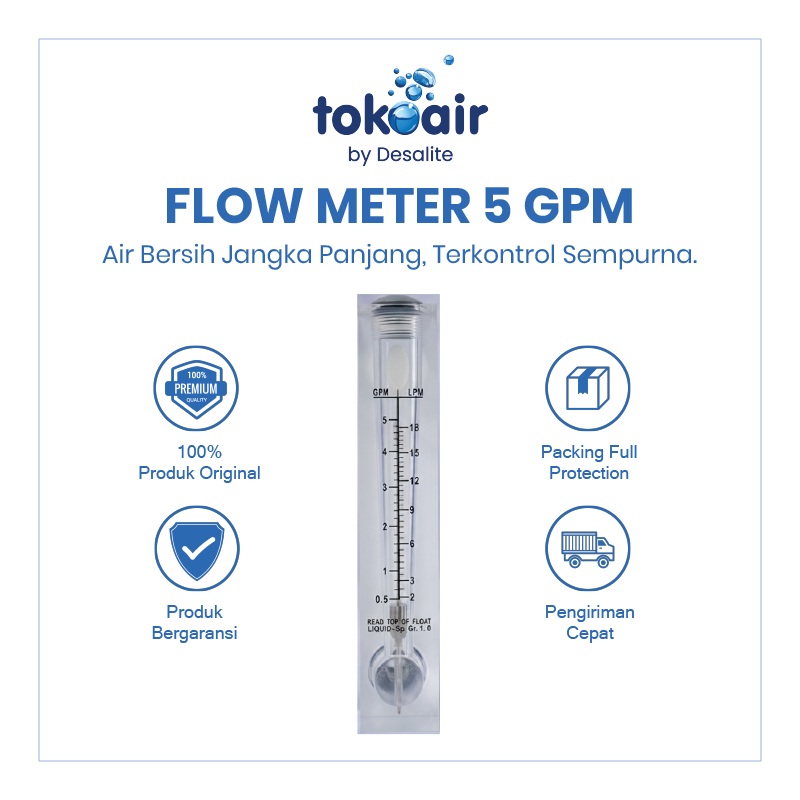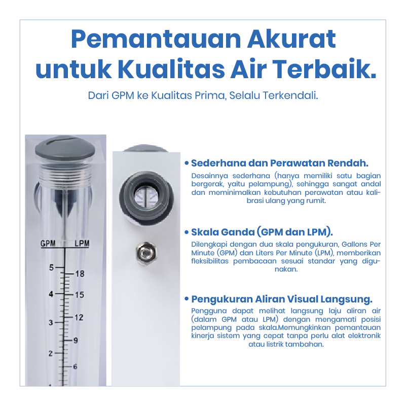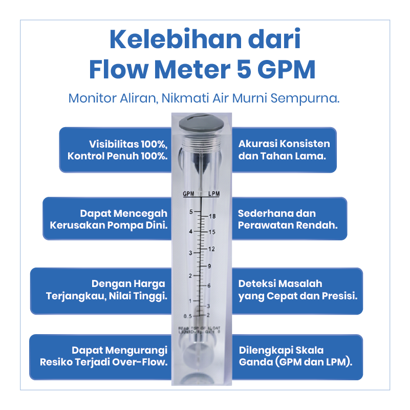 Flow Meter 5 GPM merupakan alat ukur yang digunakan untuk mengetahui dan memantau debit aliran air pada sistem Reverse Osmosis (RO) dan water treatment. Dengan flow meter ini, pengguna dapat memastikan aliran air berjalan sesuai kapasitas sistem sehingga kinerja filtrasi tetap optimal.