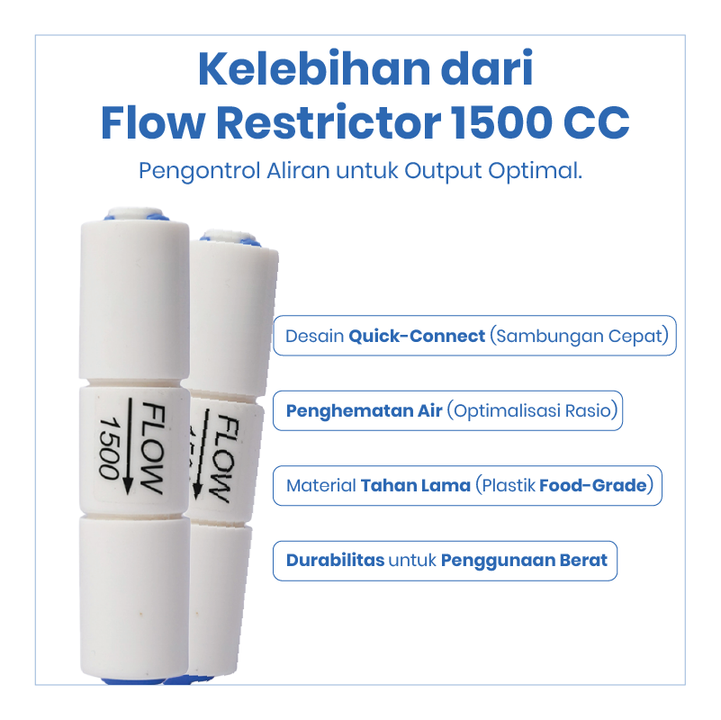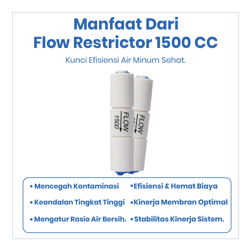 Flow Restrictor 1500 adalah komponen penting pada sistem Reverse Osmosis (RO) yang berfungsi mengatur aliran air buangan (waste water) agar tekanan kerja pada membrane RO tetap stabil dan optimal. Produk ini sangat cocok digunakan pada mesin RO dengan kapasitas besar agar performa filtrasi tetap maksimal dan efisien.