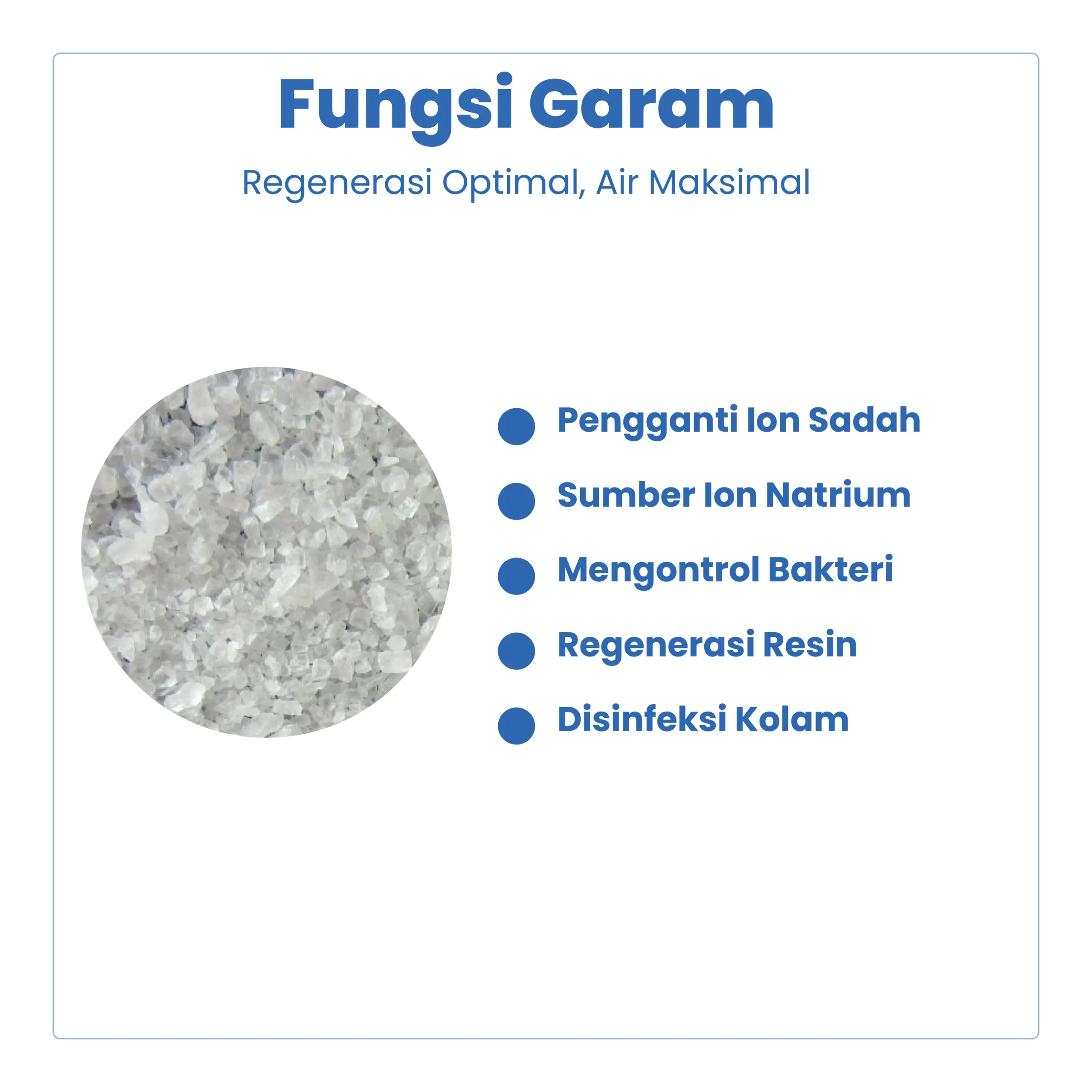 Garam regenerasi merupakan bahan utama untuk proses regenerasi resin pada sistem water softener. Berfungsi untuk mengembalikan kemampuan resin dalam menyerap kalsium dan magnesium penyebab air keras.
