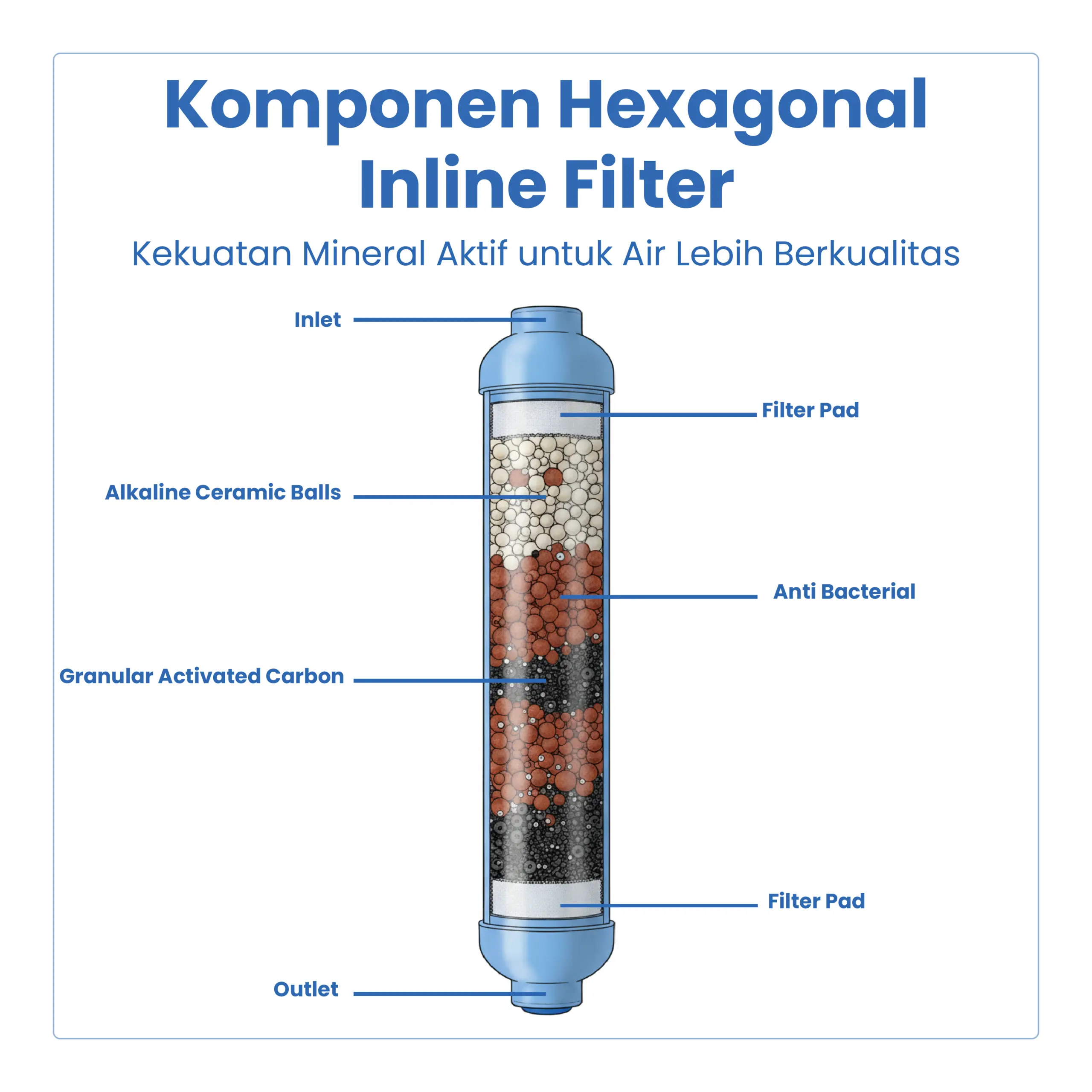 Hexagonal Inline Filter merupakan filter air inline berbentuk segi enam yang digunakan sebagai filter lanjutan pada sistem RO atau filter air. Berfungsi untuk meningkatkan kualitas air, mengurangi bau, rasa tidak sedap, serta menyempurnakan hasil filtrasi sebelum air digunakan atau dikonsumsi.