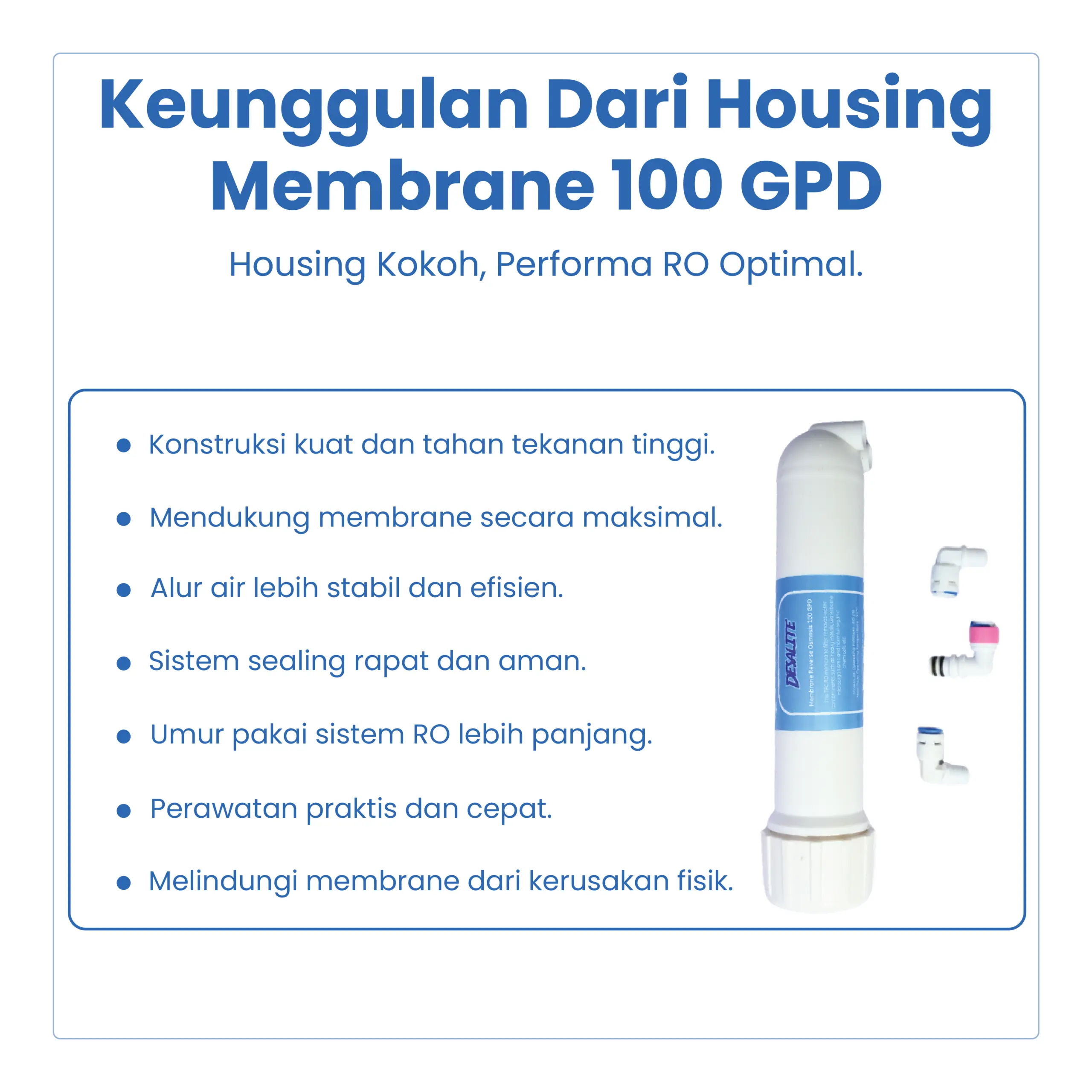 Cocok digunakan pada mesin RO rumah tangga, kantor, kafe, maupun usaha kecil yang membutuhkan sistem penyaringan air dengan kapasitas 100 GPD.