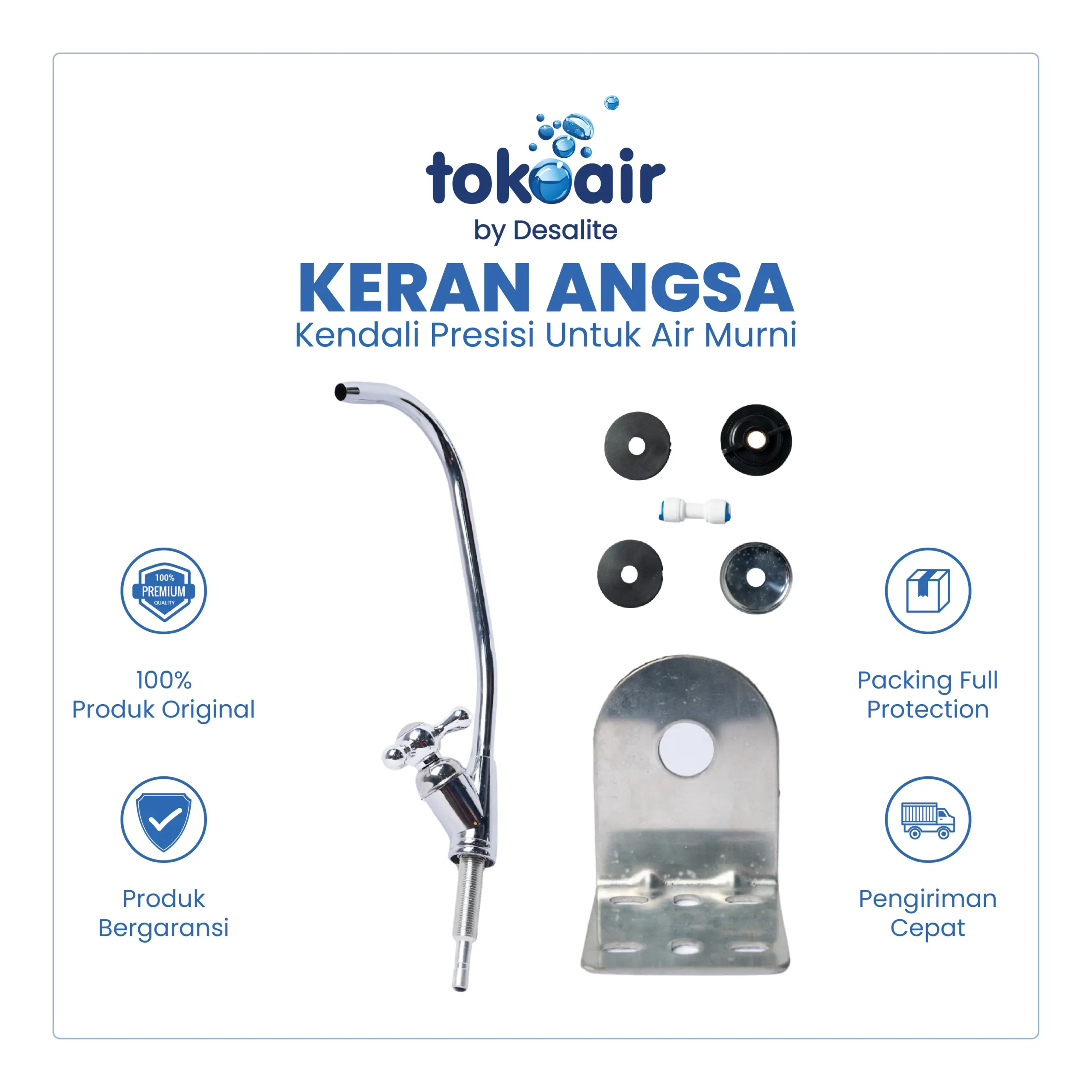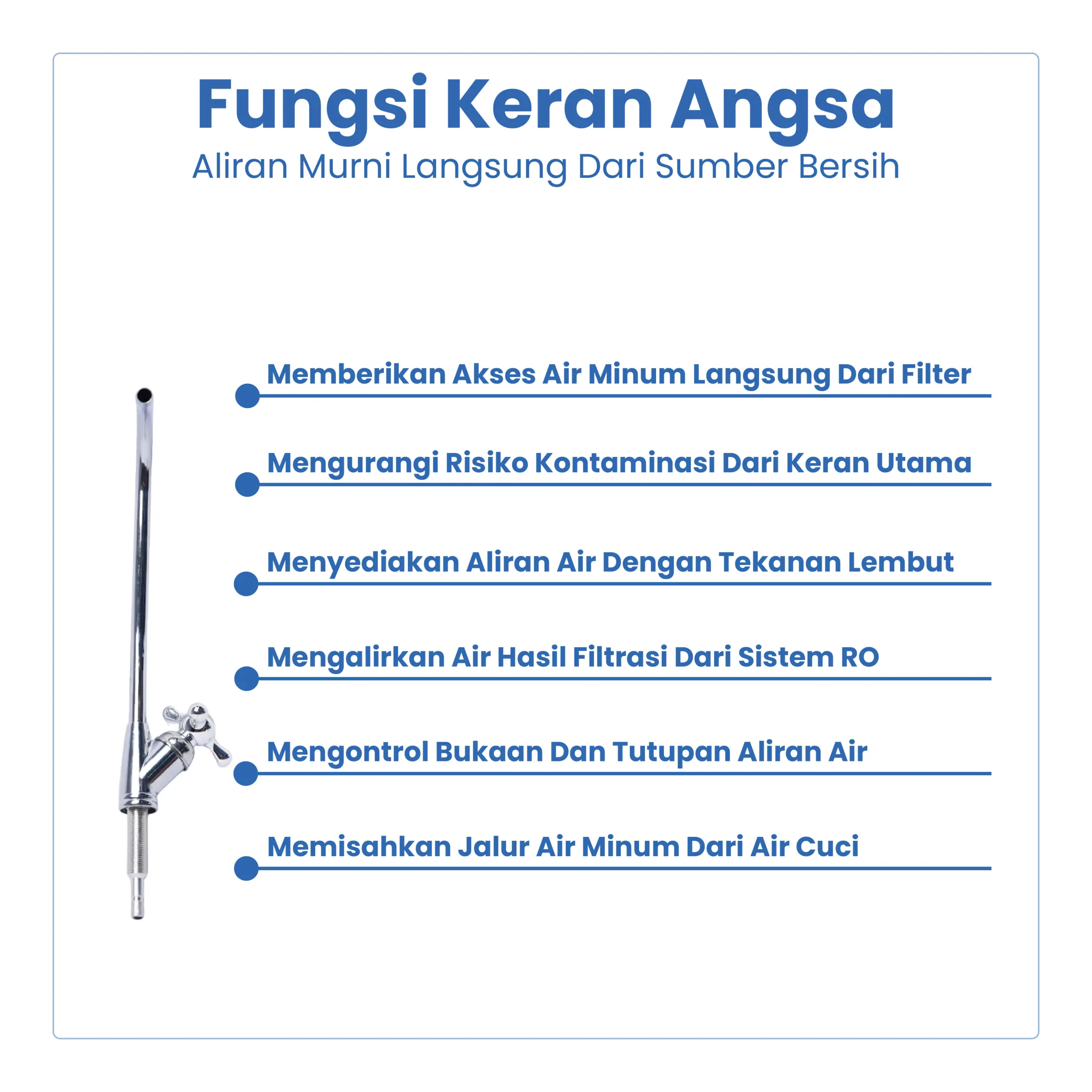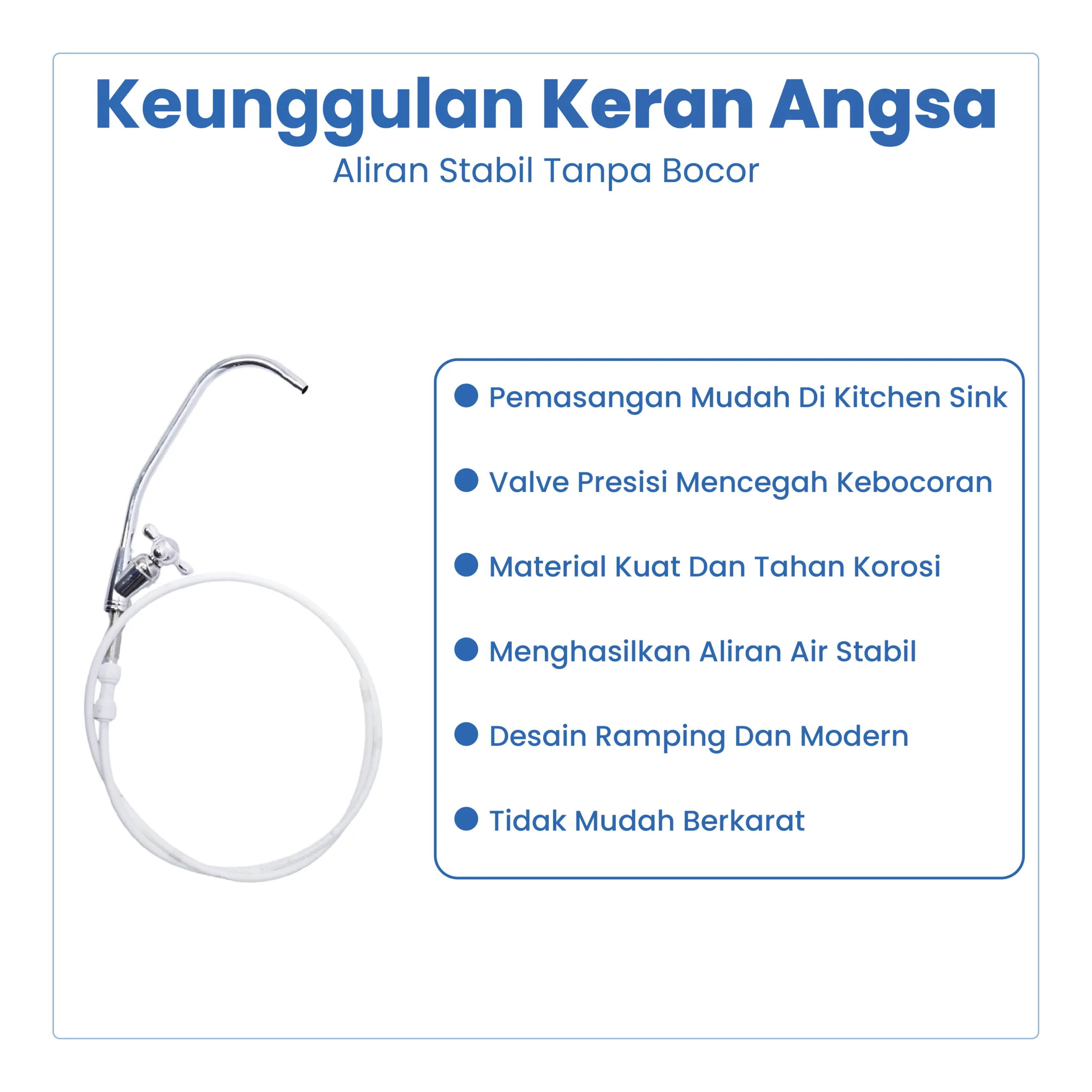 Keran Angsa merupakan keran khusus air minum yang umum digunakan pada mesin RO, water purifier, dan sistem filter air. Desain leher angsa (gooseneck) memberikan tampilan elegan serta memudahkan pengambilan air minum dengan aliran yang terarah dan stabil.
