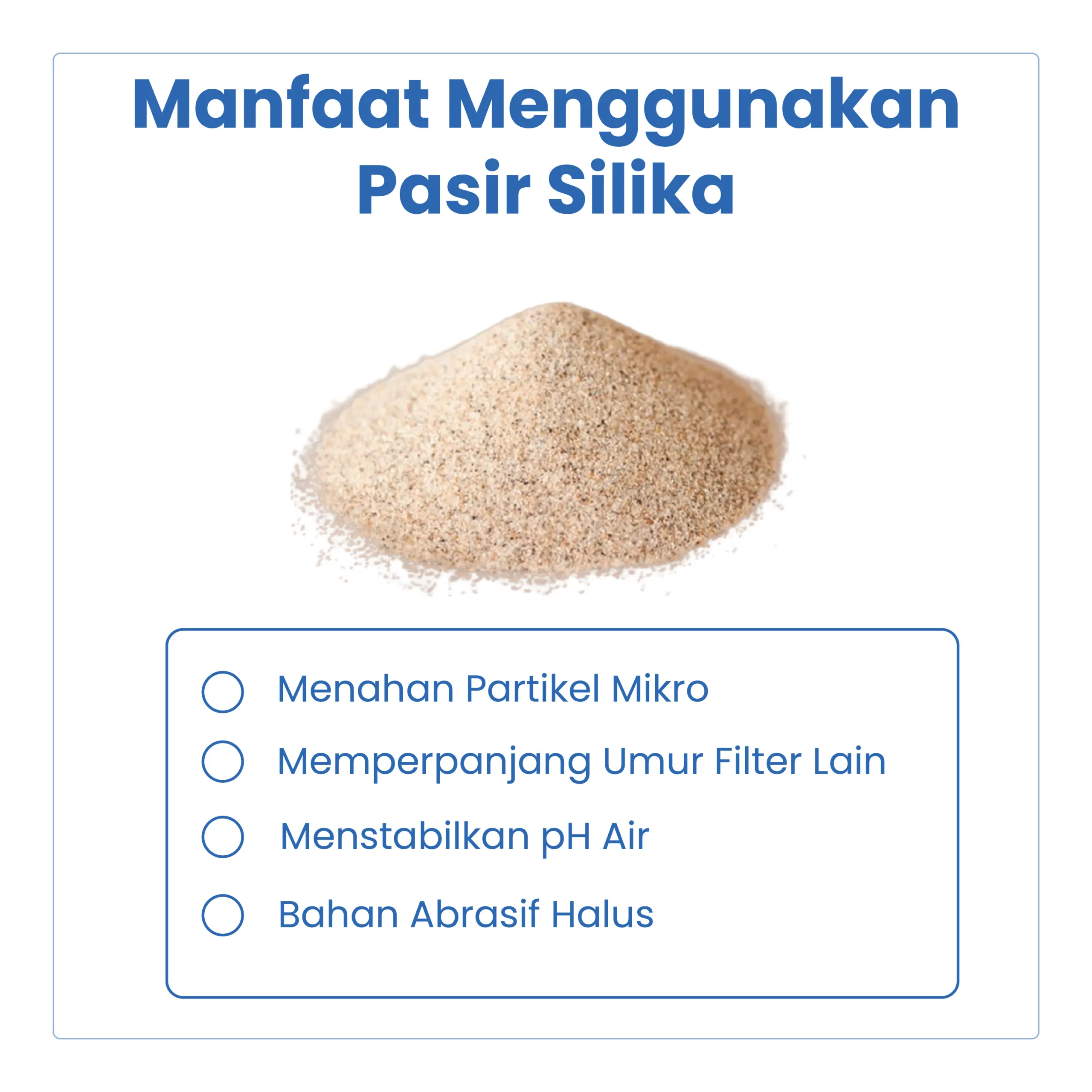 Pasir Silika merupakan media filter air yang digunakan untuk menyaring kotoran, lumpur, dan partikel halus penyebab kekeruhan pada air. Media ini berfungsi sebagai penyaringan awal (pre-filter) sehingga air menjadi lebih jernih sebelum masuk ke tahapan filtrasi berikutnya.