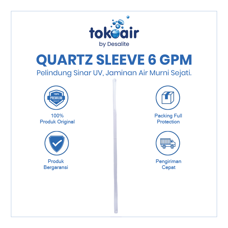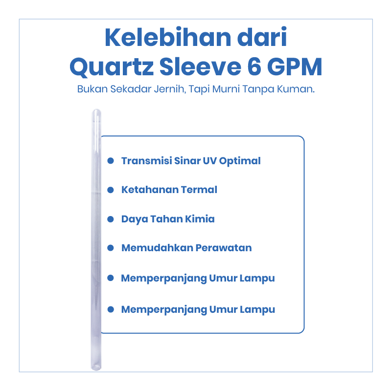 Quartz Sleeve 6 GPM merupakan tabung kaca khusus yang digunakan sebagai pelindung lampu UV pada sistem water treatment. Berfungsi untuk melindungi lampu UV dari kontak langsung dengan air sekaligus memastikan transmisi sinar UV tetap maksimal untuk proses sterilisasi air.