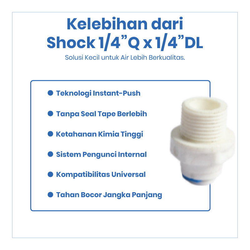 Shock 1/4” Q x 1/4” DL merupakan fitting lurus yang digunakan untuk menghubungkan selang RO 1/4” dengan komponen berdrat luar 1/4” pada sistem Reverse Osmosis (RO) dan filter air. Fitting ini membantu instalasi menjadi lebih rapi, kuat, dan minim kebocoran.