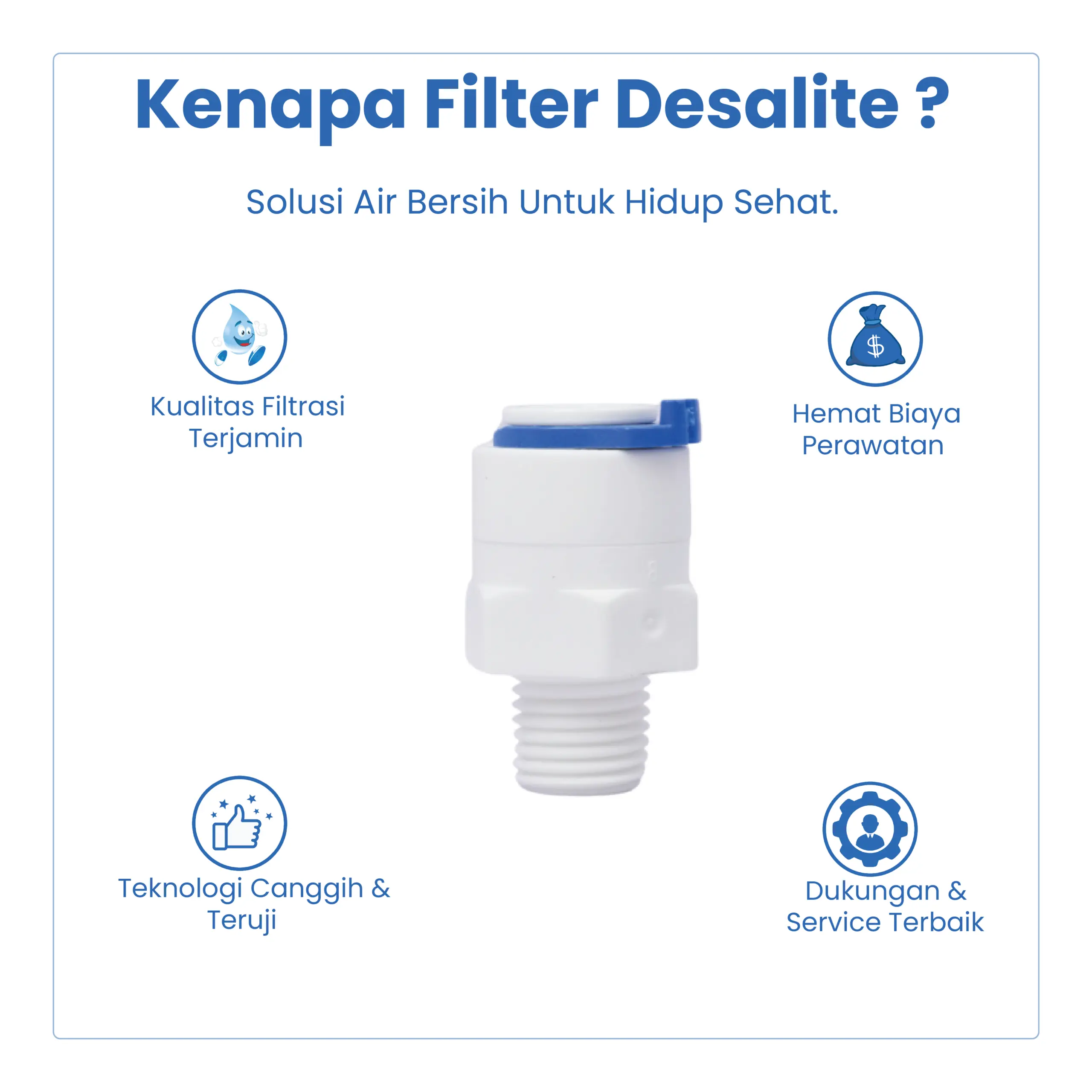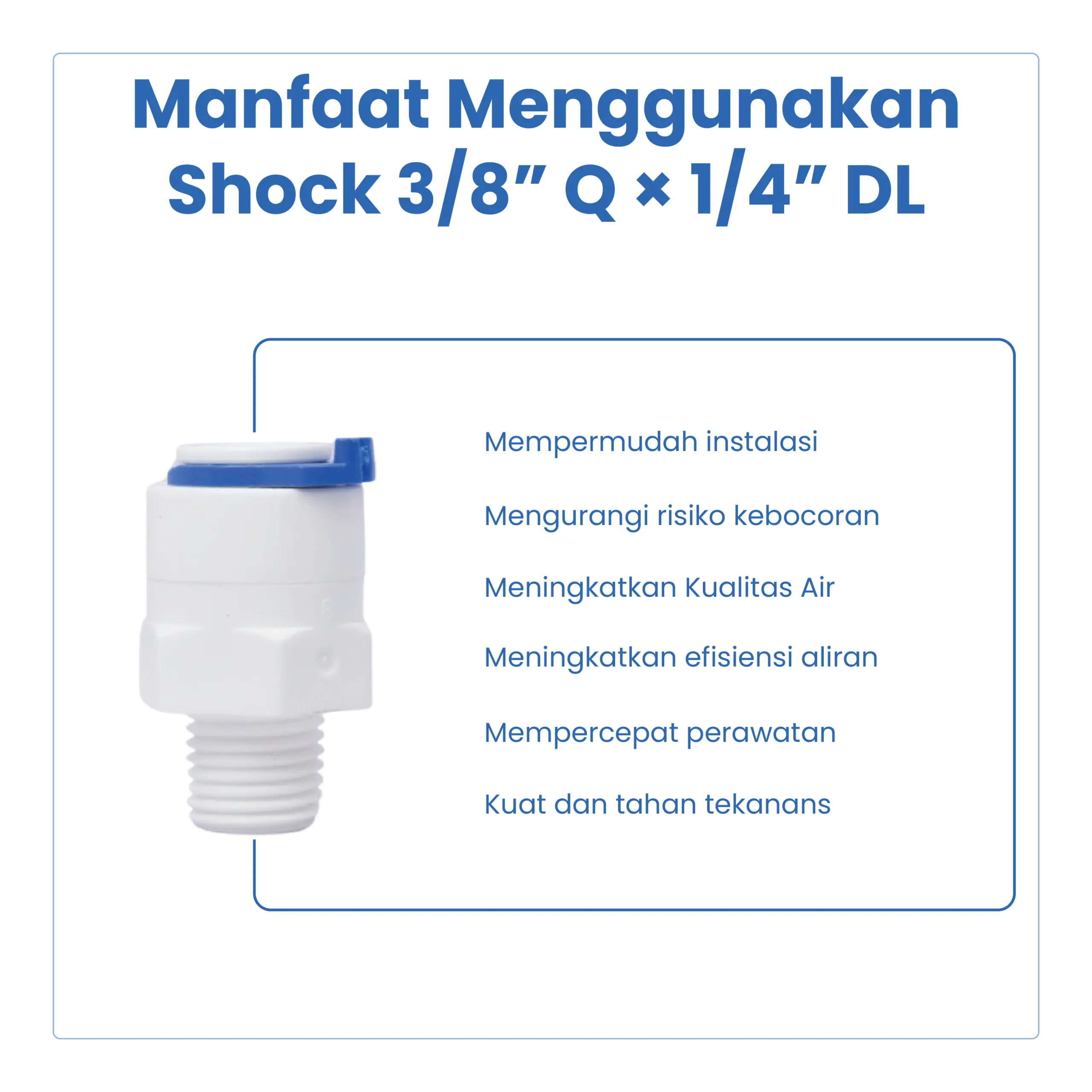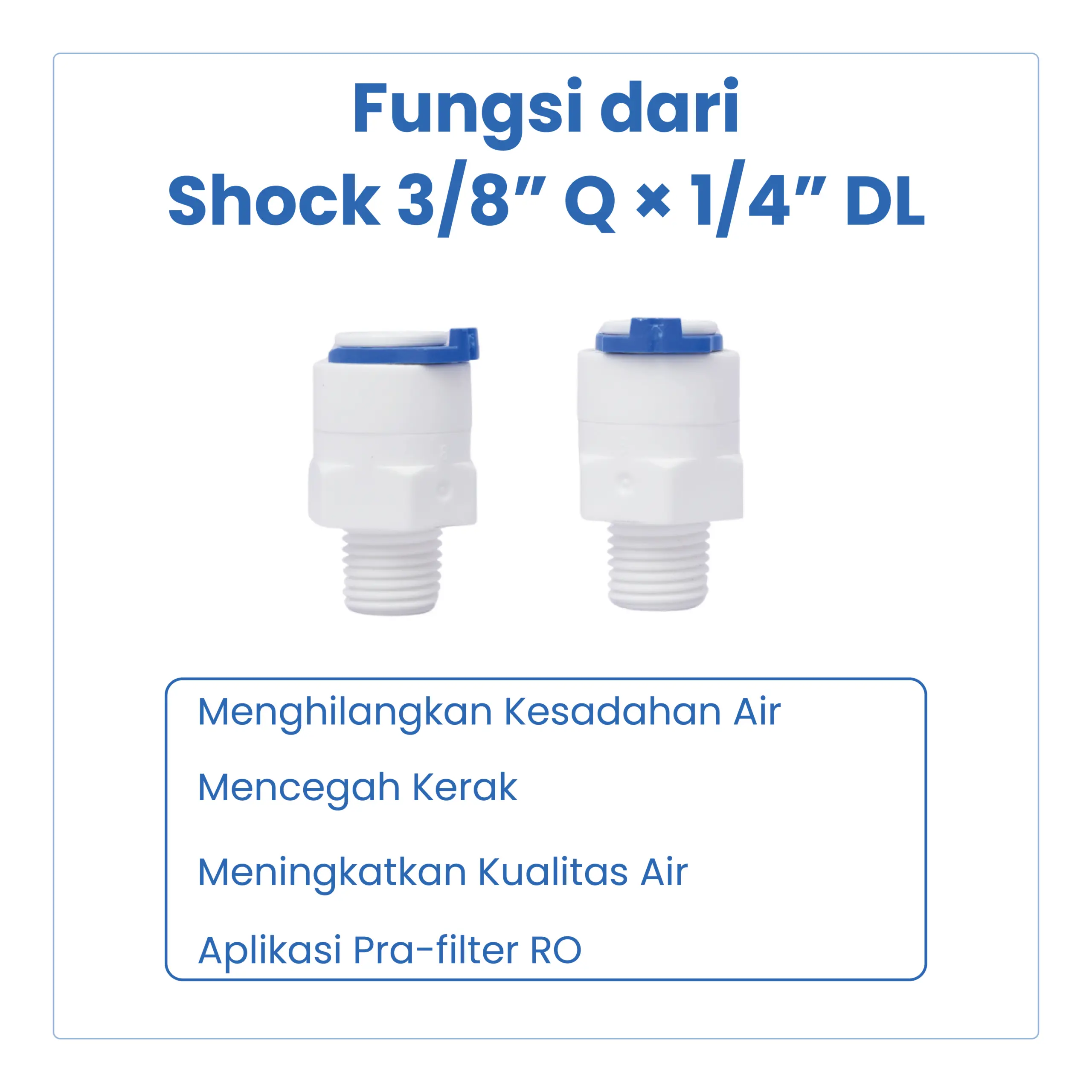 Shock 3/8” Q x 1/4” DL adalah fitting konektor yang digunakan untuk menghubungkan selang RO ukuran 3/8” ke port drat luar 1/4” pada housing, valve, atau komponen water treatment lainnya. Fitting ini membantu instalasi selang menjadi lebih rapi, kuat, dan anti bocor.