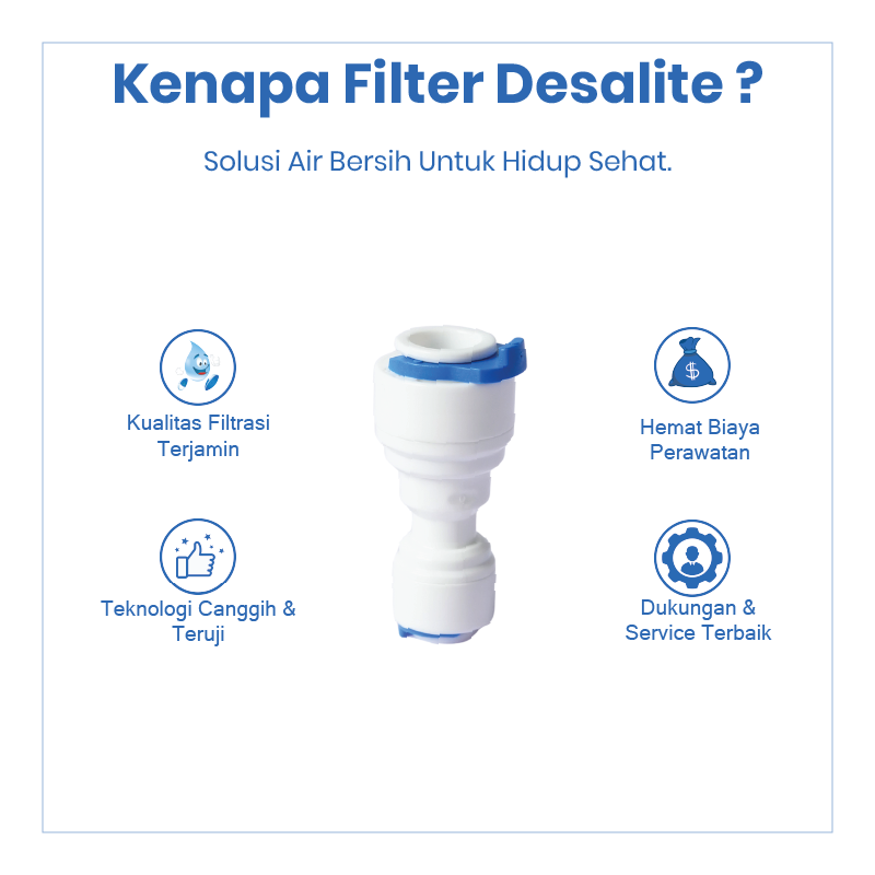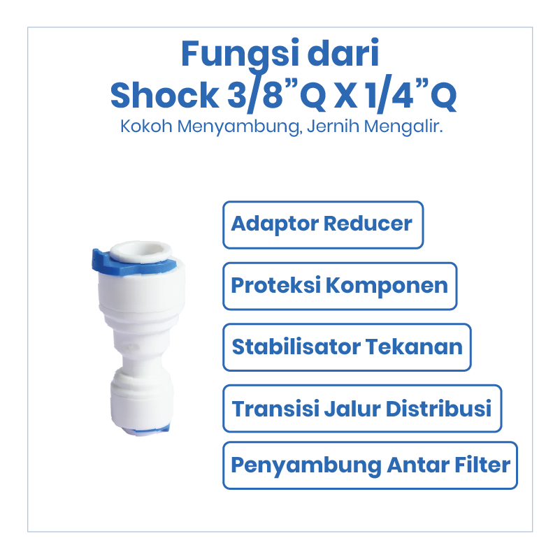 Shock 3/8” Q x 1/4” Q merupakan fitting lurus reduksi yang digunakan untuk menghubungkan selang RO ukuran 3/8” ke selang RO 1/4” pada sistem Reverse Osmosis (RO) dan filter air. Fitting ini memudahkan penyesuaian ukuran selang agar instalasi tetap rapi, kuat, dan minim kebocoran.