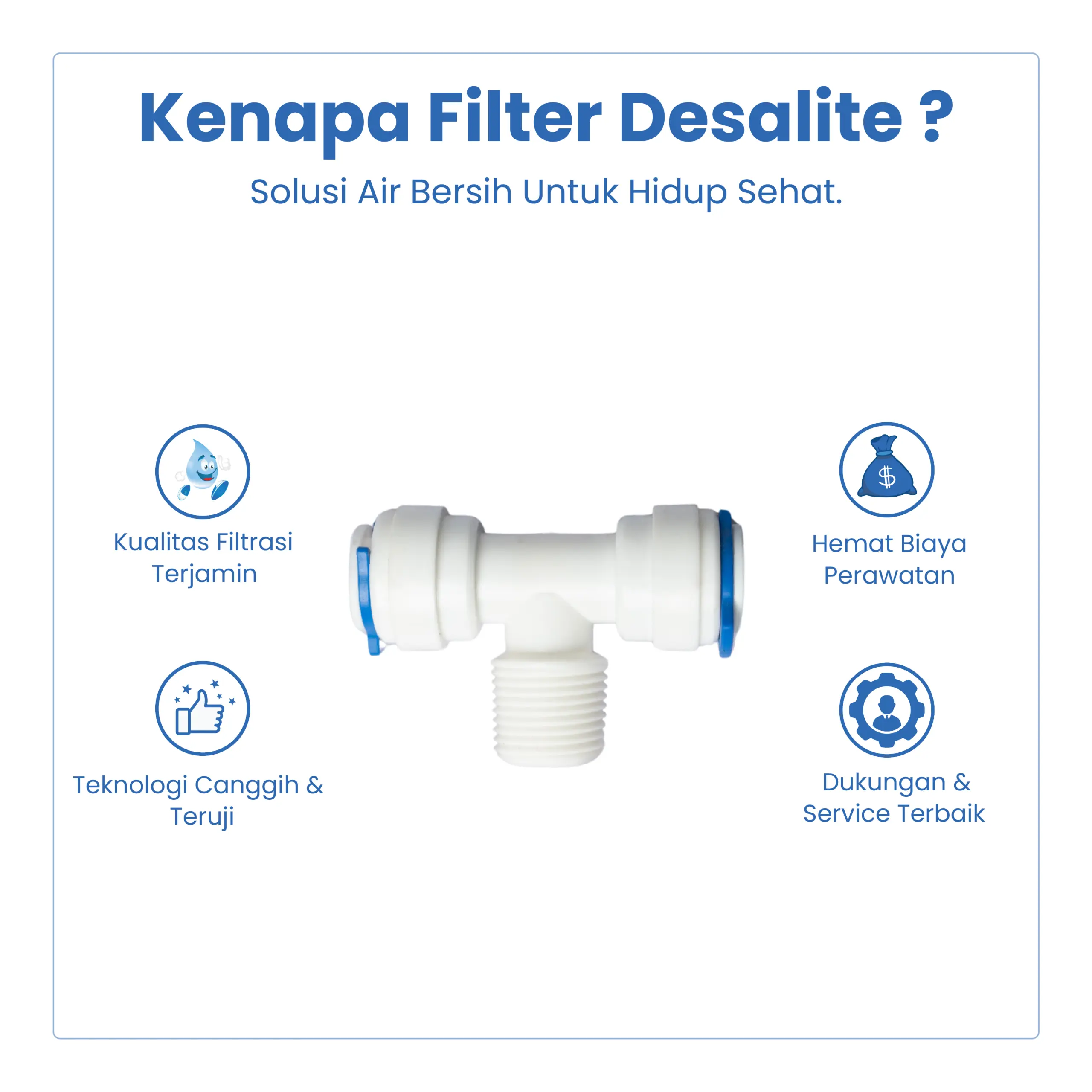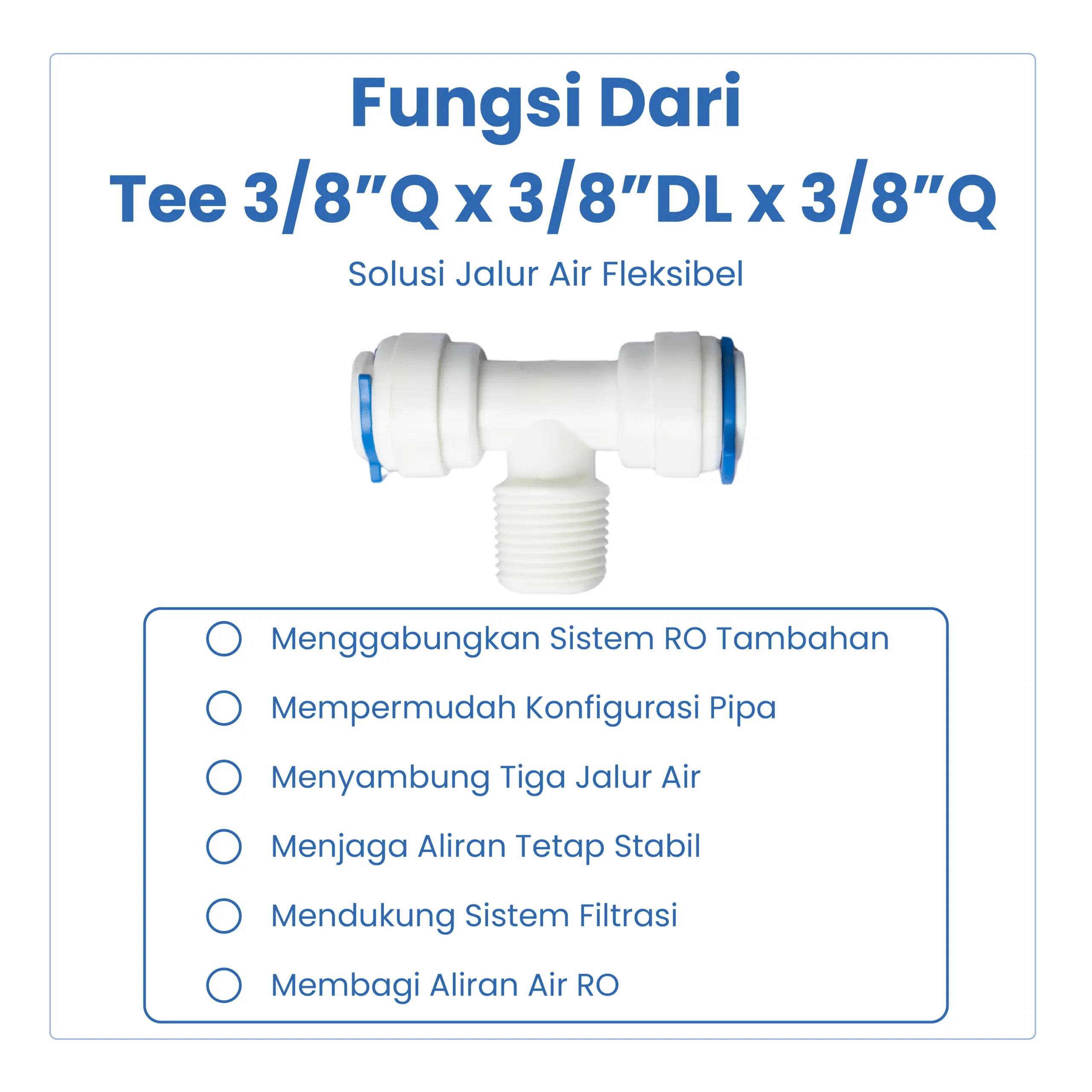 Tee 3/8” Q × 3/8” DL × 3/8” Q merupakan konektor berbentuk T yang berfungsi untuk membagi atau menyatukan aliran air dari selang dan sambungan drat. Umumnya digunakan pada mesin RO, filter air, water purifier, dan instalasi air yang memerlukan percabangan jalur air.