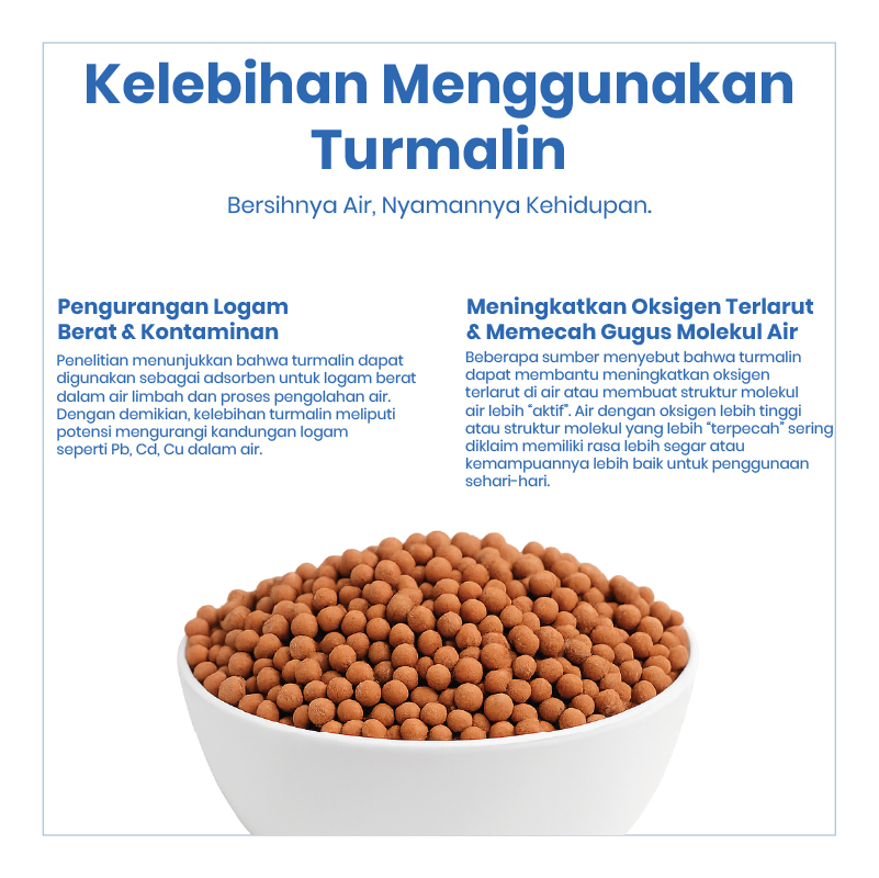 Turmalin merupakan media filter air alami yang digunakan dalam sistem water treatment untuk membantu meningkatkan kualitas air. Batu turmalin dikenal memiliki kemampuan membantu menstabilkan pH air serta mendukung proses mineralisasi sehingga air menjadi lebih segar dan nyaman digunakan. Media ini umum digunakan pada sistem filtrasi air minum, filter RO, maupun filter mineral untuk membantu memperbaiki kualitas air hasil penyaringan.